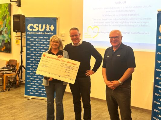 Den Erlös von 1000 Euro vom CSU-Stand auf dem Neu-Ulmer Stadtfest 2025 überreichte Julia Lidl an Prof.Daniel Steinbach, Vorsitzender des Vereins PalliKJUR, ein Palliativteam, das u.a. an der Uniklinik Ulm die ambulante Palliativversorgung für Kinder und Jugendliche organisiert.