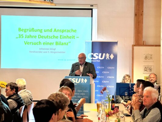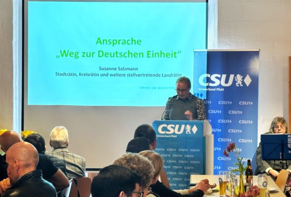 Für die leider erkrankte Hauptrednerin – Oberbürgermeisterin Katrin Albsteiger – sprachen Johannes Stingl (Ortsvorsitzender und Zweiter Bürgermeister) und Susanne Salzmann (Stv. Landrätin) zum Thema: „Der Weg zur Deutschen Einheit“.